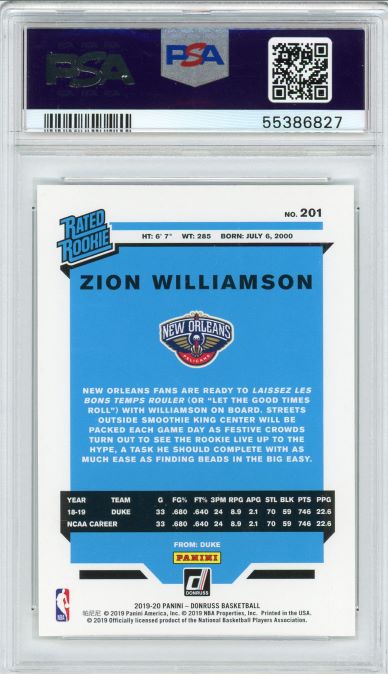 ZION WILLIAMSON 2019 PANINI DONRUSS RC #201 PSa10 GEM MINT