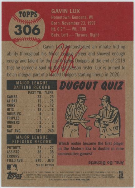2020 Topps Living Set Gavin Lux RC SP Card #306 Rookie Los Angeles Dodgers LAD