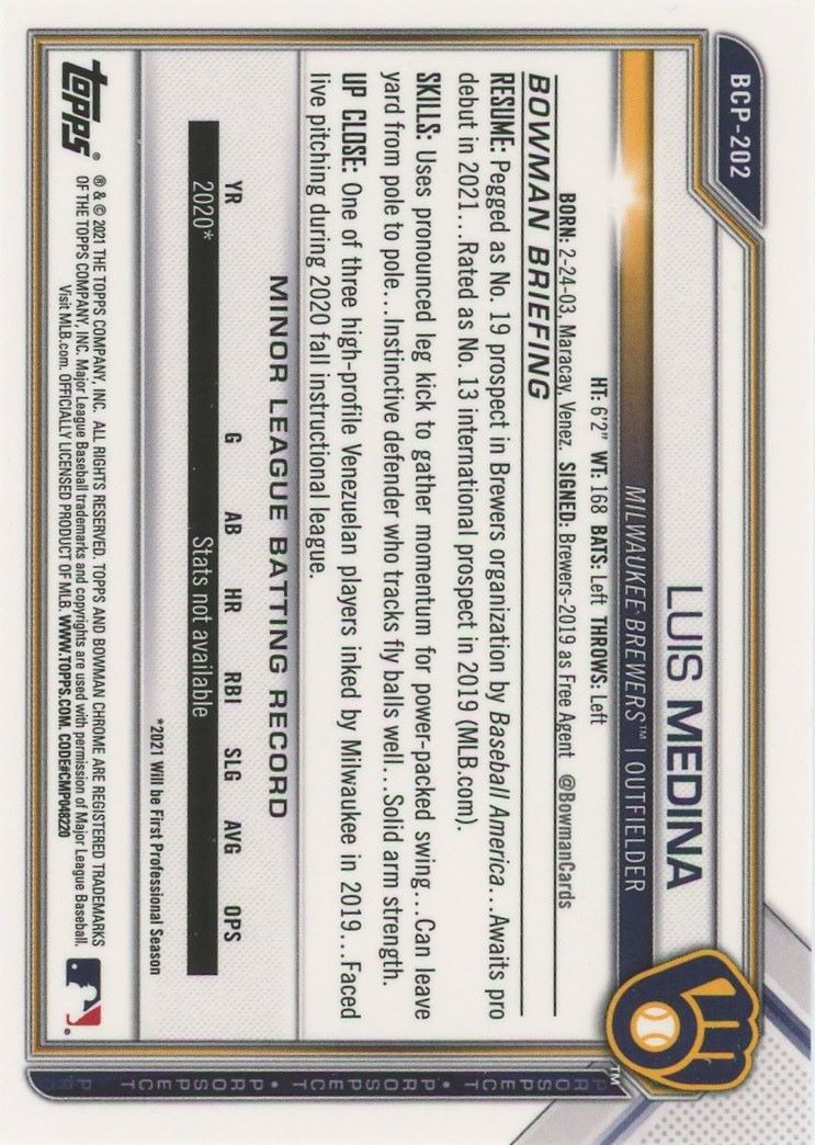 Introducing the 2021 Bowman Chrome Luis Medina 1st Bowman Mojo Refractor #BCP-202, a must-have for any serious trading card collector. This limited edition card features a unique mojo refractor design and is the first of its kind for rising star Luis Medina. With only a limited number available, don't miss your chance to add this highly coveted card to your collection.