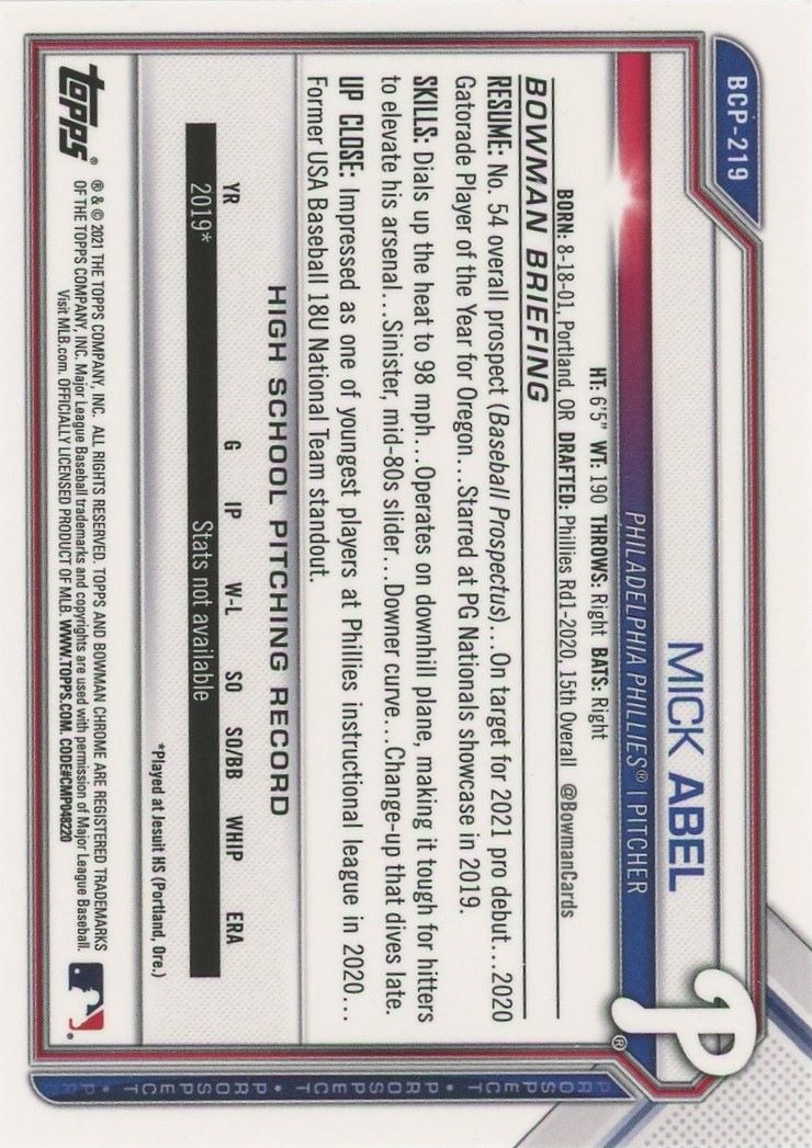 2021 Bowman Chrome Mick Abel Prospect Mojo Refractor #BCP-219 Phillies