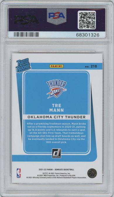 2021 Donruss Tre Mann Holo Orange Laser Rated Rookie #218 PSA 9 OKC
