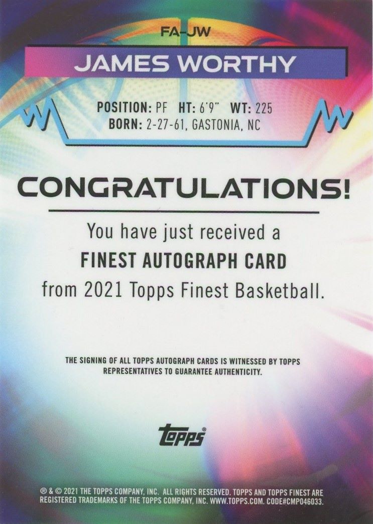 The 2021 Topps Finest Basketball James Worthy Auto #FA-JW features an authentic autograph from basketball legend James Worthy. This limited edition card is a must-have for collectors and avid fans, showcasing Worthy's skill and talent in a unique and collectible way.
