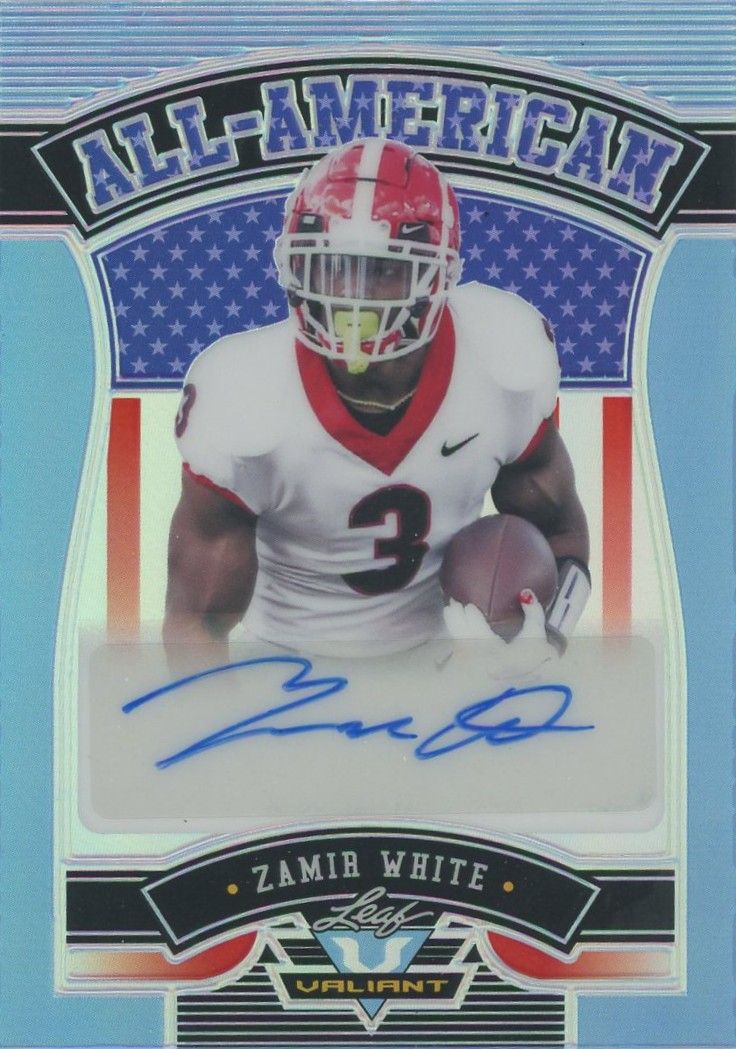 Rare Zamir White 2022 Leaf Valiant All-American Auto Blue parallel, numbered #3/10. Features authentic on-card signature from the NFL running back. Card #AA-ZW1 showcases White in his collegiate uniform with premium Leaf Valiant technology and striking blue design elements. Highly sought-after low-numbered collectible for serious football card investors.